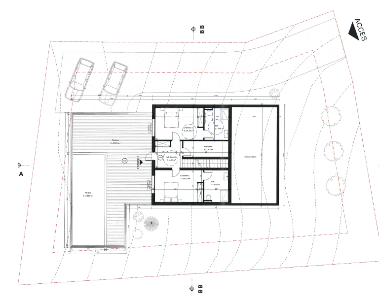 Au rez-de-jardin, vous retrouverez une buanderie et deux grandes chambres, chacune disposant de sa propre salle d’eau avec W.C. L’ensemble s’ouvre sur une belle terrasse de 60 m2 avec piscine en béton (9 x 3 m), idéale pour profiter des beaux jours.