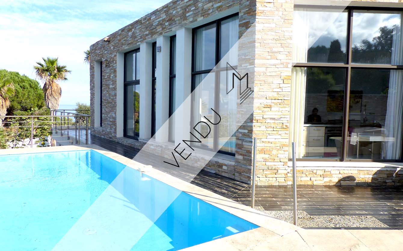 Villa contemporaine en pierre de taille et pierre de parement, avec une agréable vue sur mer située à 700 mètres des plages édifiée sur un terrain de 920m² avec une agréable piscine à débordement, grandes terrasses, cette