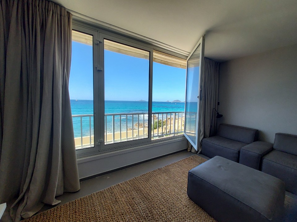 Studio pieds dans l’eau d’une superficie de 42m2. Le bien est composé d’un séjour, d’un coin chambre, d’ne salle d’eau et wc séparé. Vous bénéficierez d’une sublime vue mer panoramique. A l’extérieur, charmante plage au pied de l’immeuble. Un parking extérieur avec portail motorisé assurera confort et sécurité.